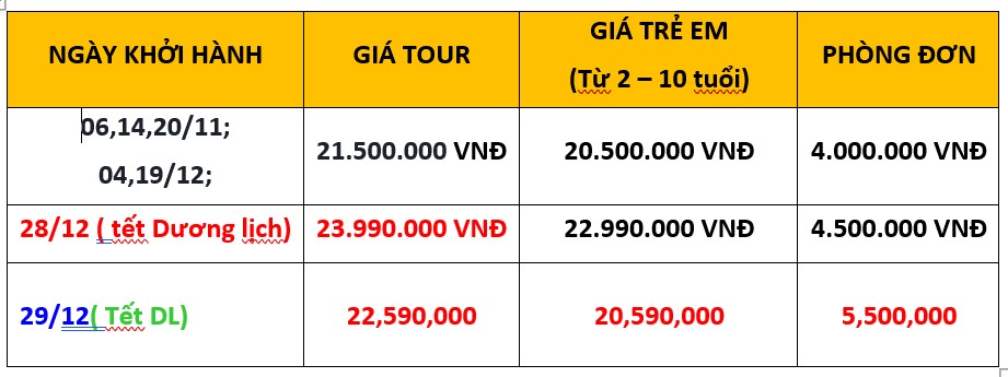 Ngày khởi hành : 06,14,20/11 --- 04,19, 28,29/12 (Tết Dương lịch)