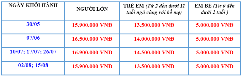 Ngày khởi hành : 30/05; 07/06; 10/07; 17/07; 26/07; 02/08; 15/08/2024