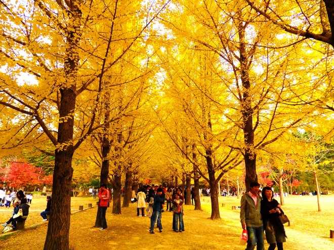 Mùa thu Hàn Quốc bắt đầu từ tháng 9 đến tháng 11. Cả xứ sở Kim Chi phủ màu vàng như tranh vẽ. Từ thủ đô Seoul tới vùng núi, trung du miền biển và cả các tỉnh cực nam. Cây ngân hạnh được chọn làm cây trồng chính của thành phố từ năm 1971, tạo thành tông màu vàng chủ đạo mỗi độ thu về. Điểm xuyết thêm là những hàng cây phong đỏ và một số cây khác. Cây Nomiji lá hình cánh sao mà các bạn trẻ vẫn thích vẽ đầy trong vở. Gió thu bứt nhẹ những chiếc lá đỏ thẫm đẹp mắt rồi nghịch ngợm xào xạc rơi trên đầu, níu chân bao lữ khách.