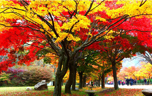 Mùa thu ở Hàn Quốc đẹp như trong cổ tích, không chỉ có vẻ đẹp của lá vàng khiến người ta liên tưởng đến bức tranh “Mùa thu vàng” nổi tiếng của họa sĩ Levitan, mà còn điểm xuyến thêm màu đỏ của lá phong. Những mảng lá vàng, lá đỏ đan xen khắp nơi nơi, cùng với những thảm lá rụng dưới chân khiến cho quang cảnh trở nên lãng mạn và đẹp đến mê hồn vào dịp tháng 9 mỗi độ thu sang.